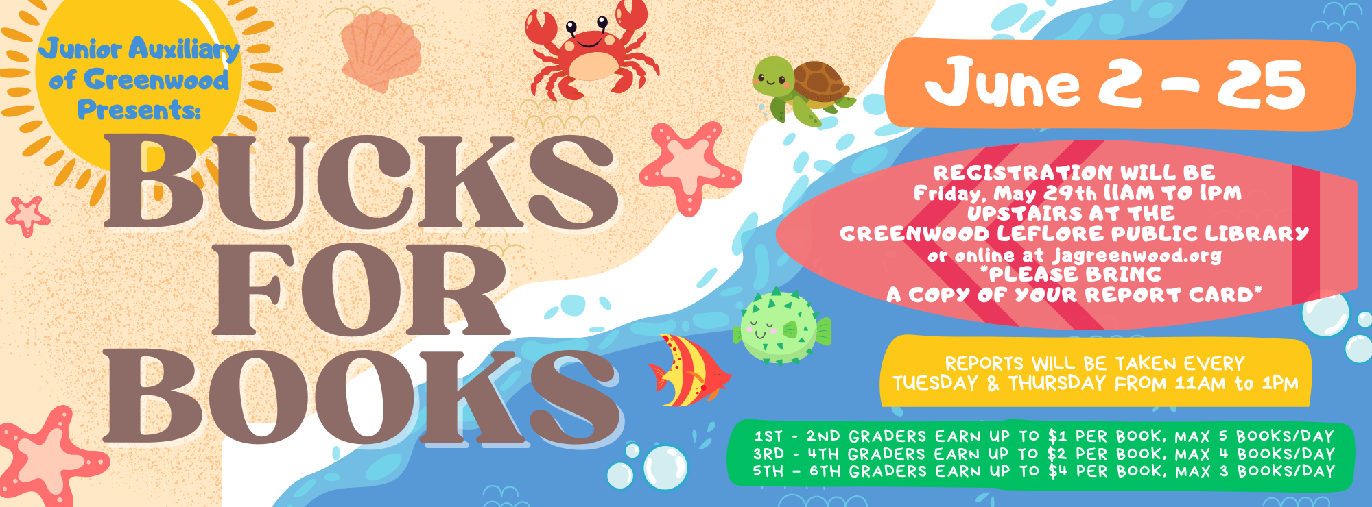 Registration will be Friday, May 29th from 11:00 a.m. to 1:00 p.m. at the Greenwood Leflore Library or you can register online using the forms at the bottom of this page. Reports will be taken in person each Tuesday and Thursday from 11:00 a.m. to 1:00 p.m. beginning Tuesday, June 2nd through Thursday, June 25th.